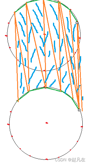 2 拼上下底面:以上下底面圆心为中心,上一步计算出来的“圆柱底边 num_points 个点”做边画三角形。