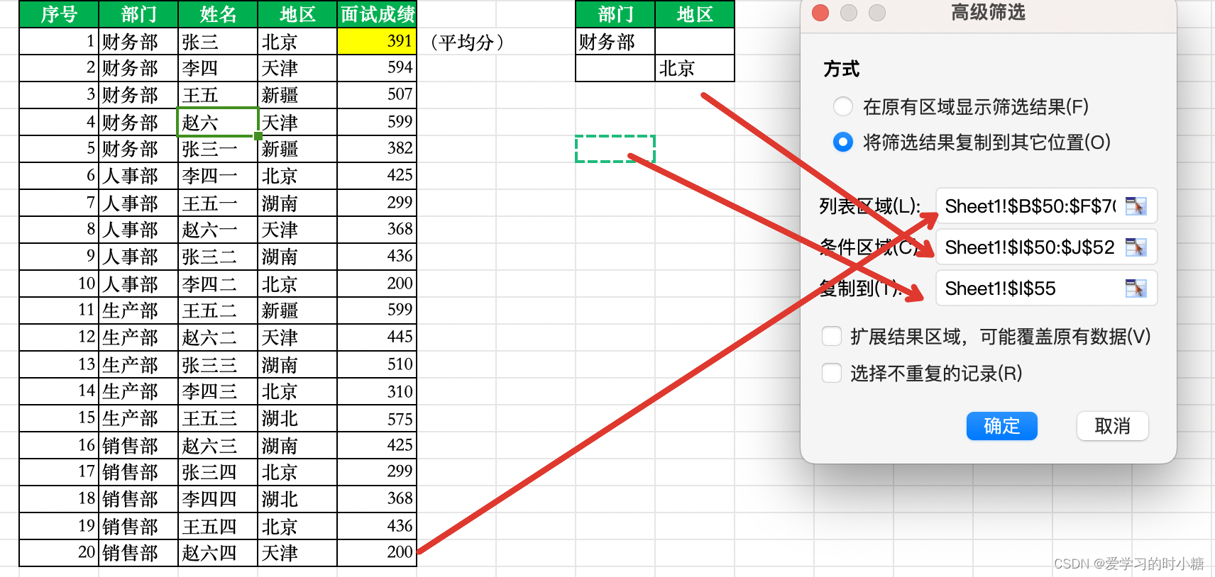 - 选择任意单元格,点击【筛选】—— 【高级筛选】,按照下图方式选择【将筛选结果复制到其他位置】——用鼠标拖动选择【列表区域】、【条件区域】、【复制区域】 ,点击【确定】即可。