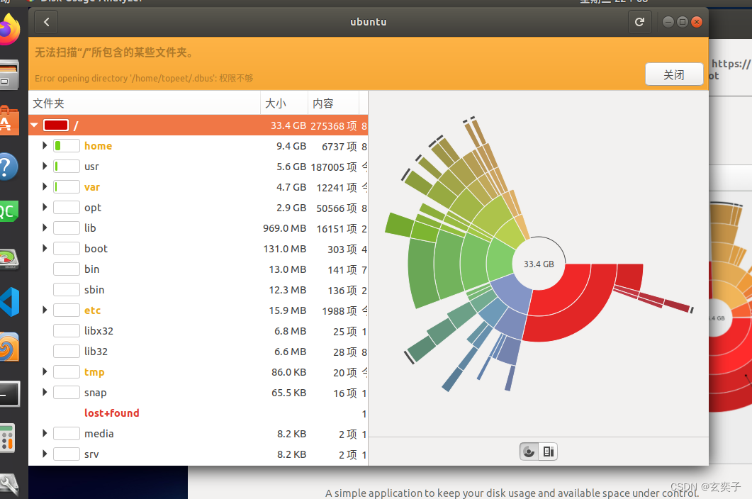 我这里选择 /home 目录进行分析,点击home目录,稍等片刻,就可以得到自己硬盘的占用情况,以及每个文件夹的大小。