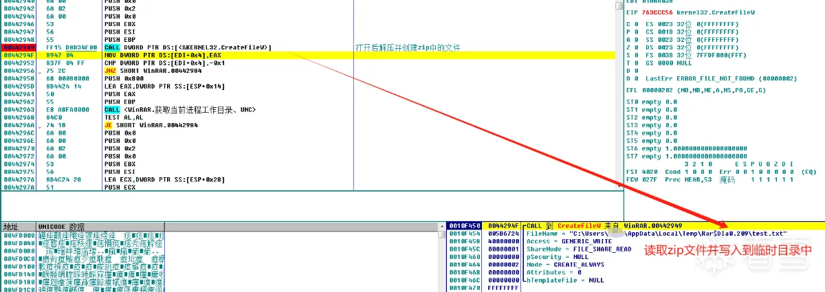 Winrar是一个GUI程序,在用户双击一个文件预览时会发送一个WM_LBUTTONDOWN消息,然后主程序根据此消息获得点击的文件名,也就是click_name,随即主程序会遍历压缩包中所有的deFileName(文件夹也在此列),当deFileName==click_name那么该文件就会被释放出来并写入临时目录中,也就是说同名文件夹下的所有文件都会被释放出来。最终Winrar会初始化ShellExecuteInfo结构体,将click_name释放后的路径设置到lpFileName中,并调用Windows系统APi ShellExecute函数执行该文件。
