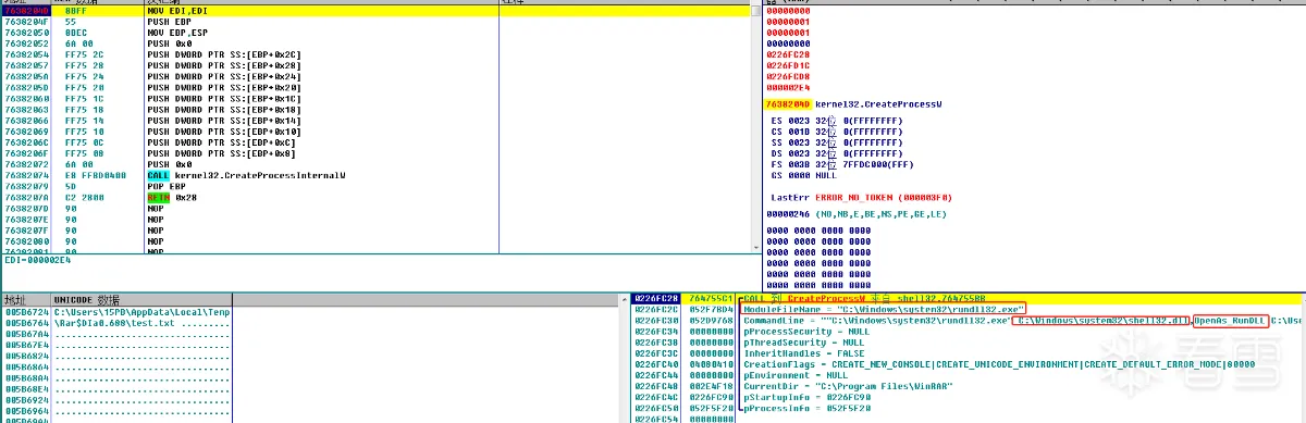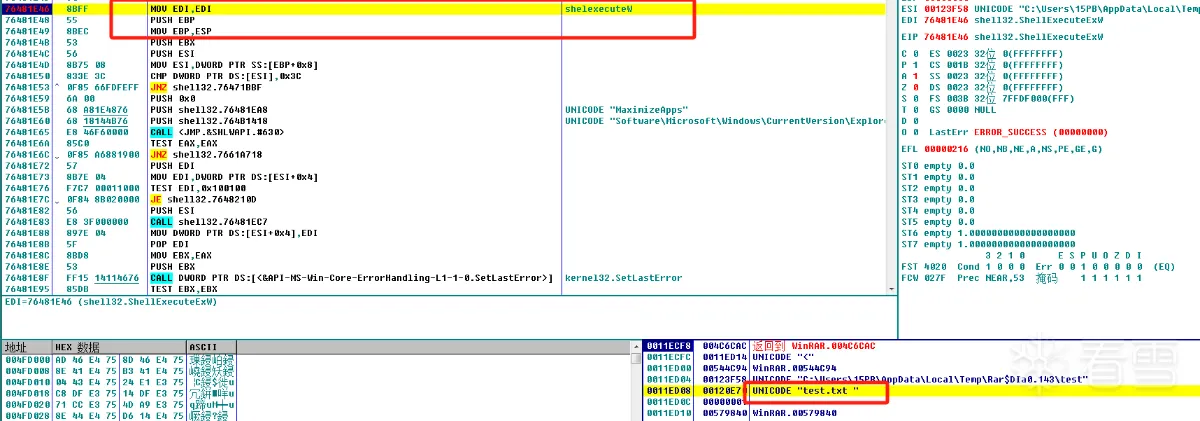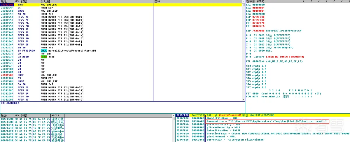 此时断点命中CreateProcessW,但这里发现一个问题,WinRAR在调用ShellexecuteW时lpFileName参数明明是"test.txt ",后面调用CreateProcesssW创建进程时却变成了”test.txt .cmd“。很明显ShellexecuteW做了一些我们不知道的操作,更改了参数。那shellexecute做了什么就变成了了解问题的关键。