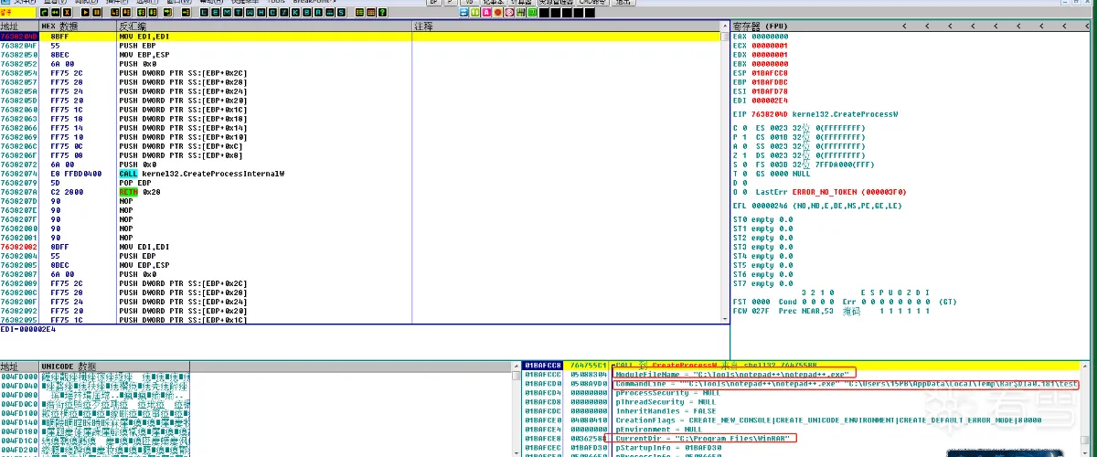 该文件为正常的.txt文本文件,后面无空格。此时再到CreateProcessW断点处,可以看到ModuleFIleName(lpApplicationName)参数被设置为notepad++的地址,CommandLine参数被设置为test.txt文件地址,这些参数都是Shellexecute进行设置的。