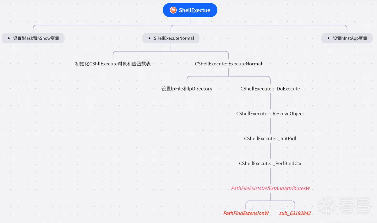 ShellExecute在Shell32.dll中,大致执行流程如下图所示,我们只关注的核心的标红函数,这三个函数是最终的问题所在,但他们不在Shell32.dll而是在Shlwapi.dll中。