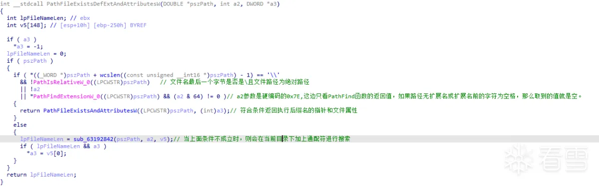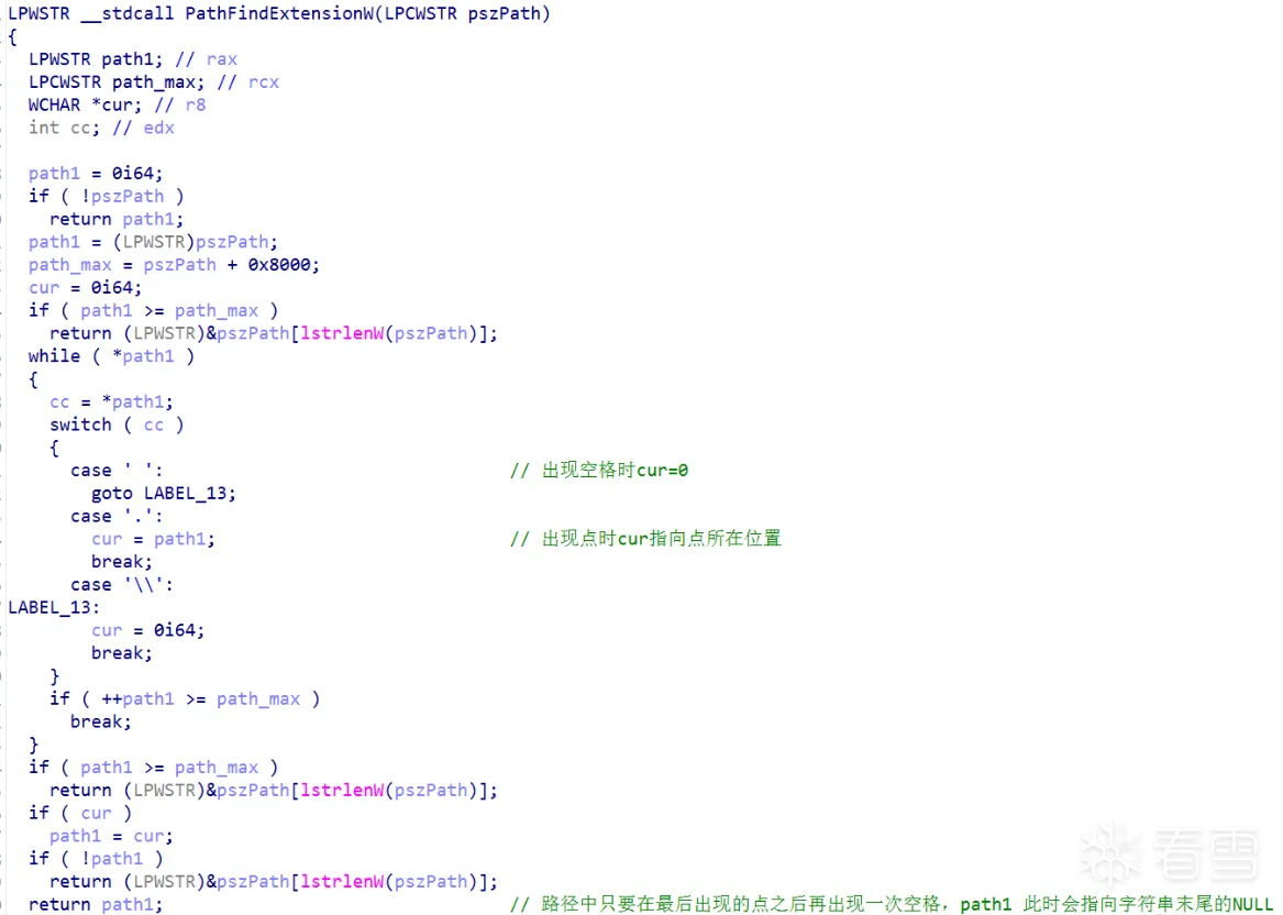 该函数没找到符号文件,IDA解析时有问题,故用了另一位博主B1tg的图。通过伪代码可以看出如果路径长度超过最大长度或在最后一个点后再次出现空格或\都会返回指向NULL的字符串指针,即未找到后缀名。这也是为什么把最后一个字符串改成空格的原因。