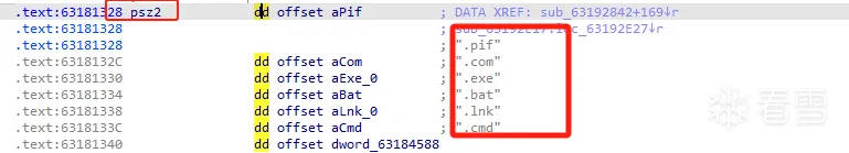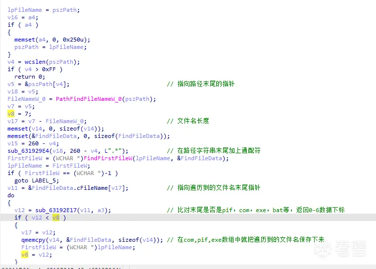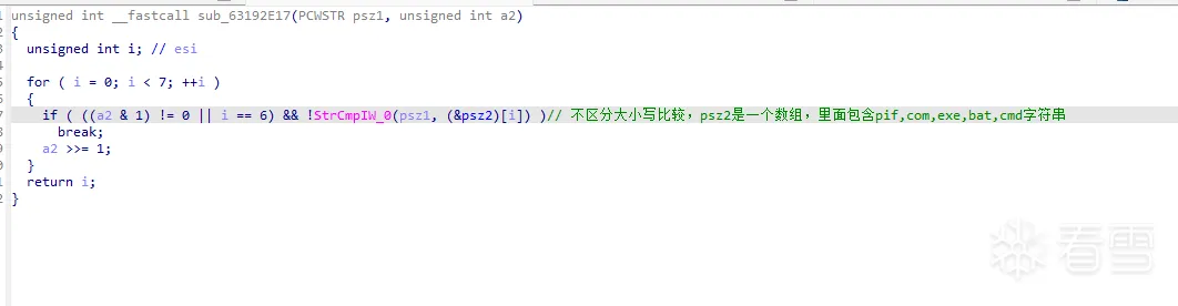 这个函数的主要功能是遍历当前路径下的所有文件,并将文件后缀和一个数组比较,数组中是windwos系统下常见可执行文件的后缀名