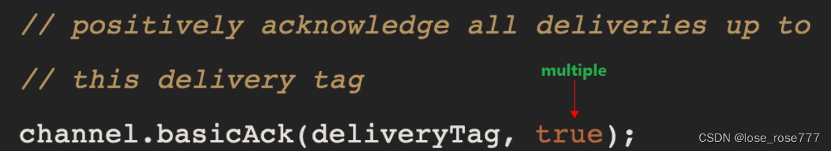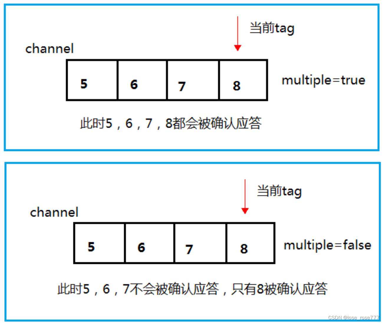 true:代表批量应答channel 上未应答的消息,比如说 channel 上有传送 tag 的消息 5,6,7,8 当前 tag 是 8 那么此时 5-8 的这些还未应答的消息都会被确认收到消息应答