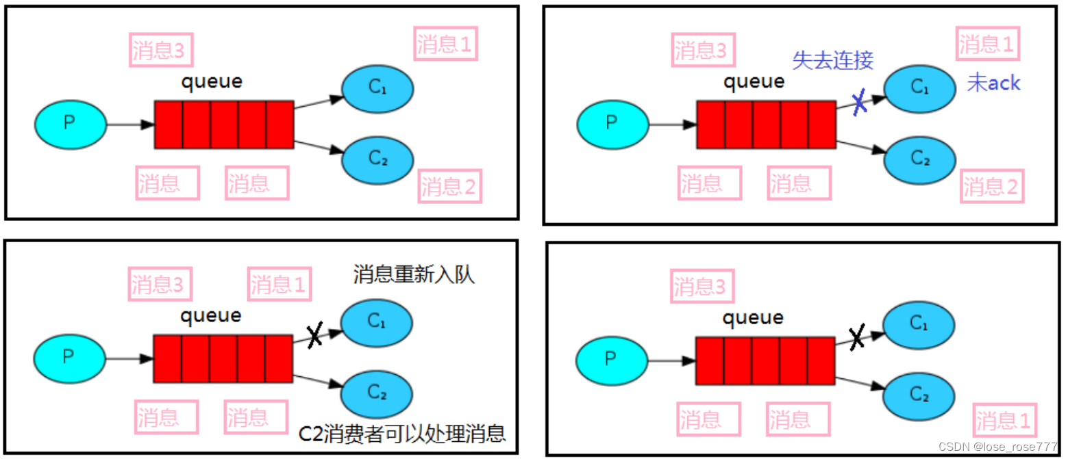 如果消费者由于某些原因失去连接(其通道已关闭,连接已关闭或 TCP 连接丢失),导致消息 未发送 ACK 确认,RabbitMQ 将了解到消息未完全处理,并将对其重新排队。如果此时其他消费者 可以处理,它将很快将其重新分发给另一个消费者。这样,即使某个消费者偶尔死亡,也可以确 保不会丢失任何消息