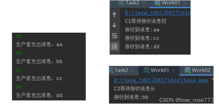 通过程序执行发现生产者总共发送 4 个消息,消费者 1 和消费者 2 分别分得两个消息,并且 是按照有序的一个接收一次消息