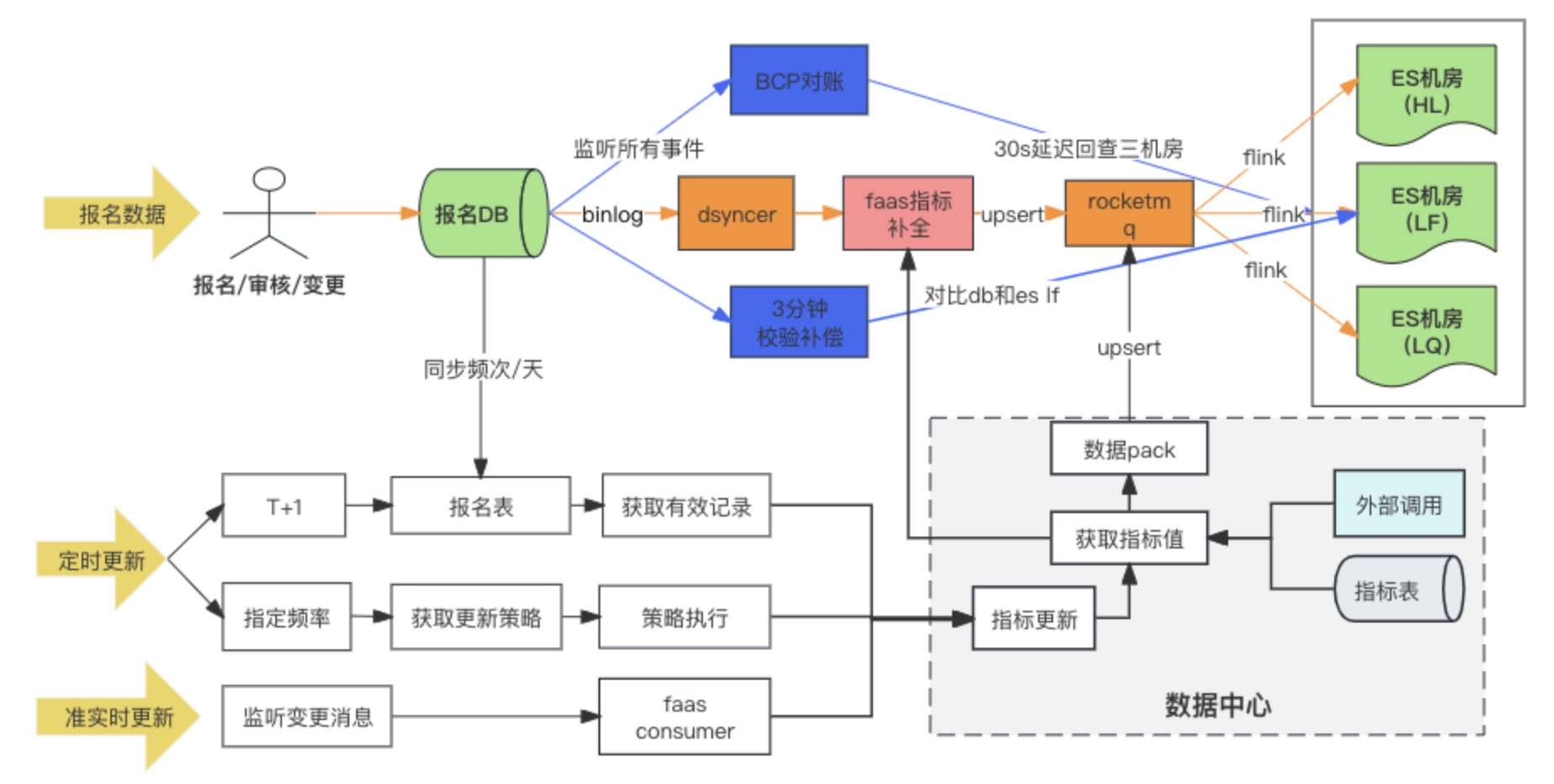主要解决 DB 报名记录如何同步到 ES,其它相关联的指标如何写入 ES,如何更新及保证数据的一致性。