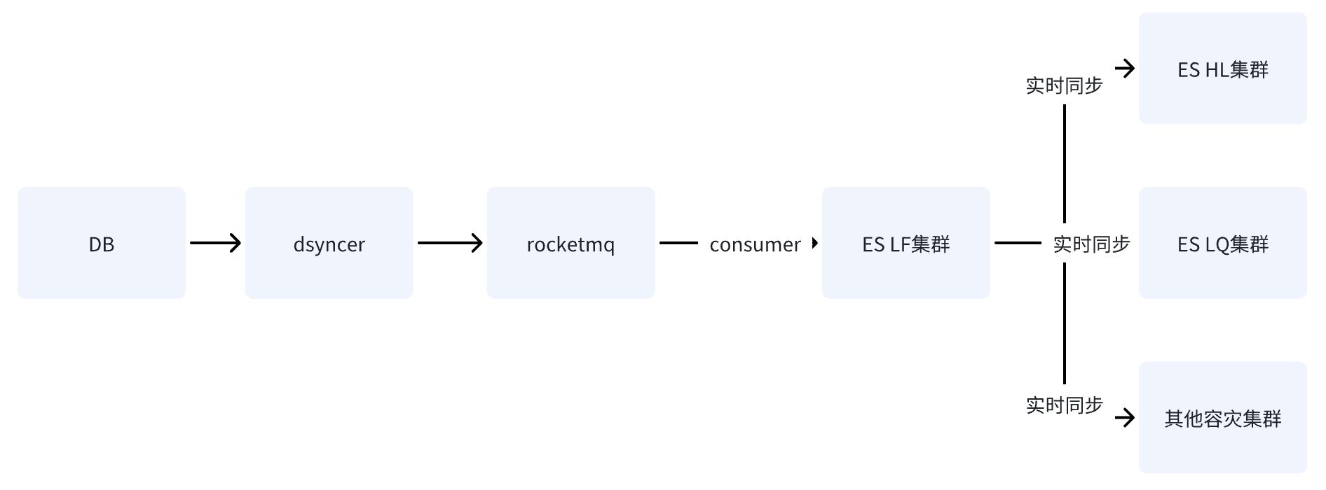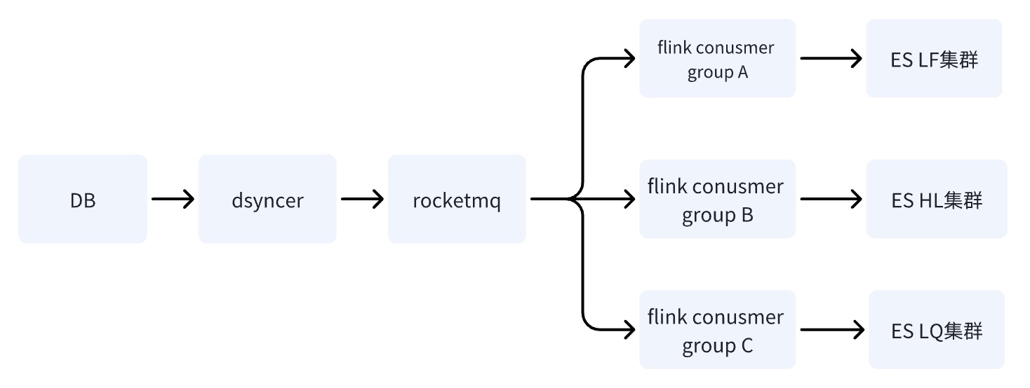 在 DB 通过 RocketMQ 写 ES 集群时,分别起多个独立的 Conusmer Group 任务,系统可采用 Flink 分布式系统,将数据分别写入多个机房。