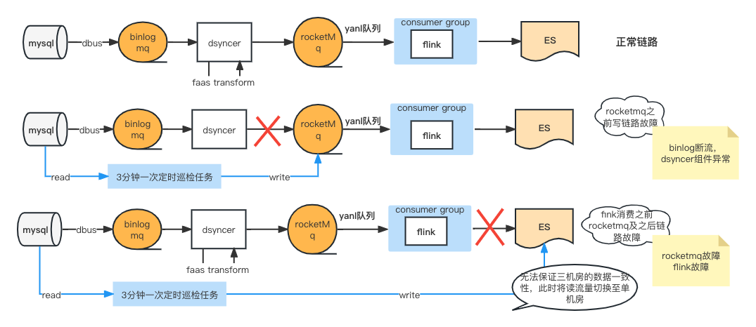 三分钟一次的对账默认情况下我们会认为组件功能完好,只是某节点出现短暂延迟而产生补偿,如果频繁发生补偿报警就需要进一步分析链路到底是哪里出了问题?此时在我们的场景下我会把链路一分为二,确认下 RocketMQ 之前链路出问题了,还是 RocketMQ 以及后续消费链路出现的问题。通过故障分析图,如果是 RocketMQ 之前链路出问题,比如 Binlog 断流、异构数据同步平台组件挂了等,则补偿数据直接写到 RocketMQ 中,消费到多机房的,此时读流量不用切流,且能够保证多机房数据的一致性。但如果 RocketMQ 挂了就会直接去写 ES 了,因为此时我们无法保证多机房同时写成功,所以我们的决策是只写单机房,将所有流量切换到单机房。