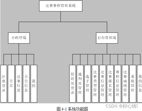 在全面健身的倡导下通过各级赛事的举办完成体育人才的选拔,当由于缺乏信息化的管理手段而只能通过人工完成比赛报名、赛程制定及成绩记录等流程的管理,因此常常因意外而导致比赛赛程管理不善、成绩不理想等问题出现。为了帮助比赛组织者优化赛程管理流程而以当前主流的移动互联网技术设计一款比赛赛程管理系统。该系统采用B/S模式的设计思路而将前端(微信小程序+Vue.js)和后端(SpringBoot框架+MyBatis框架+MySQL数据库)整合于一体而为参赛选手、裁判员和管理员提供符合角色身份的信息服务。参赛选手可在小程序前端完成注册与登录后查看比赛信息并完成报名、查看比赛成绩等;裁判员登录后端可实现赛程的制定及成绩录入等工作来保证比赛赛程的公正性;管理员则登录后端可通过裁判员、选手、比赛信息、比赛报名、赛程信息、比赛成绩及系统管理等诸多管理功能的实现来支持比赛赛程的圆满完成。