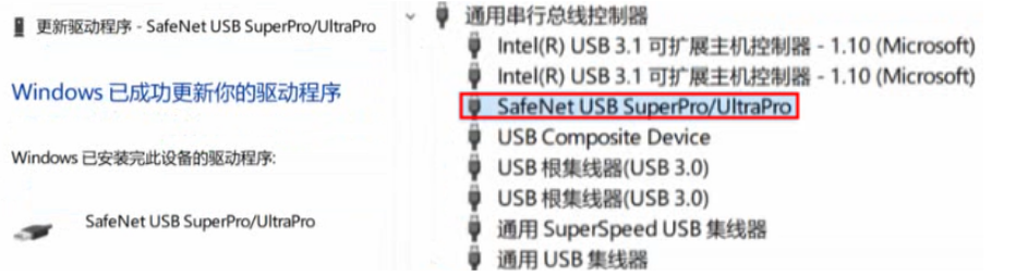 如图所示加密狗驱动程序更新完成,在该电脑上可识别
