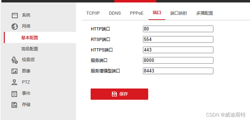 登录需要接入的RTSP设备的管理页面,在基本配置的端口里查看RTSP端口并记录下来。如果能找到RTSP开关最好选择开启。如下图: