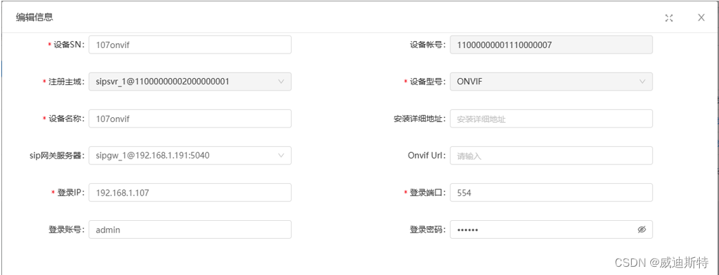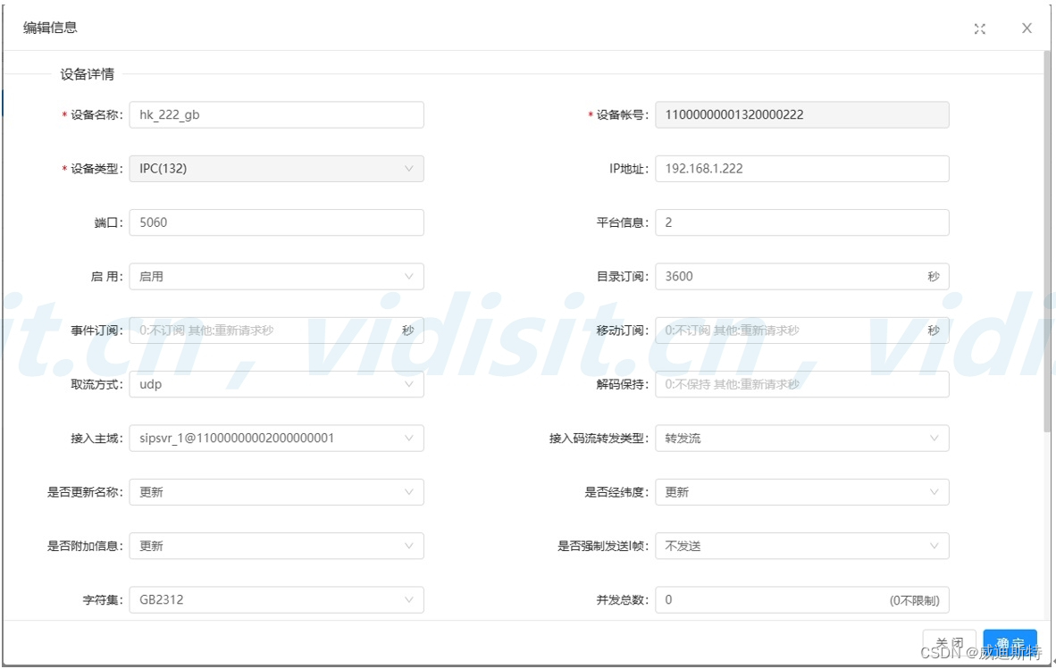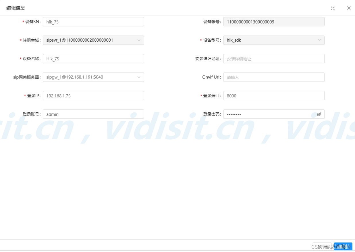 在平台设备管理的内部设备管理中添加设备,星号标记的信息必填。如下图所示。