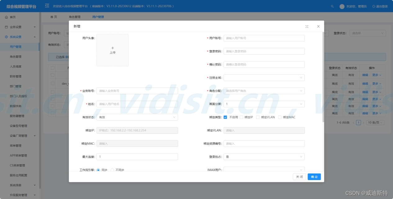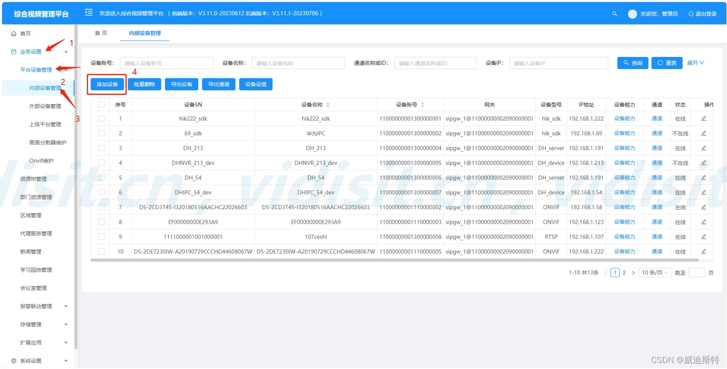 登录视频平台管理端,找到业务设置和平台设备管理,进入内部设备管理页面,选择添加设备。