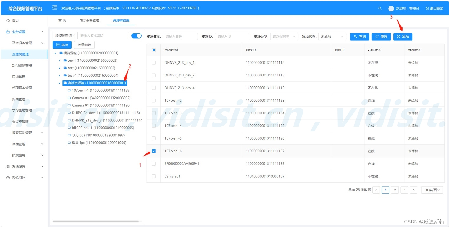 进入资源树管理界面并按照下图三个步骤把新设备添加近新的资源组中。