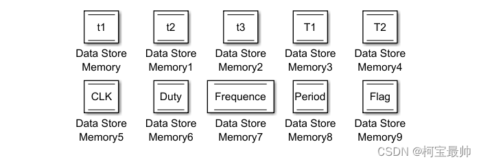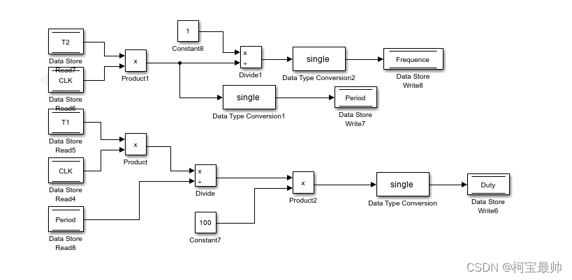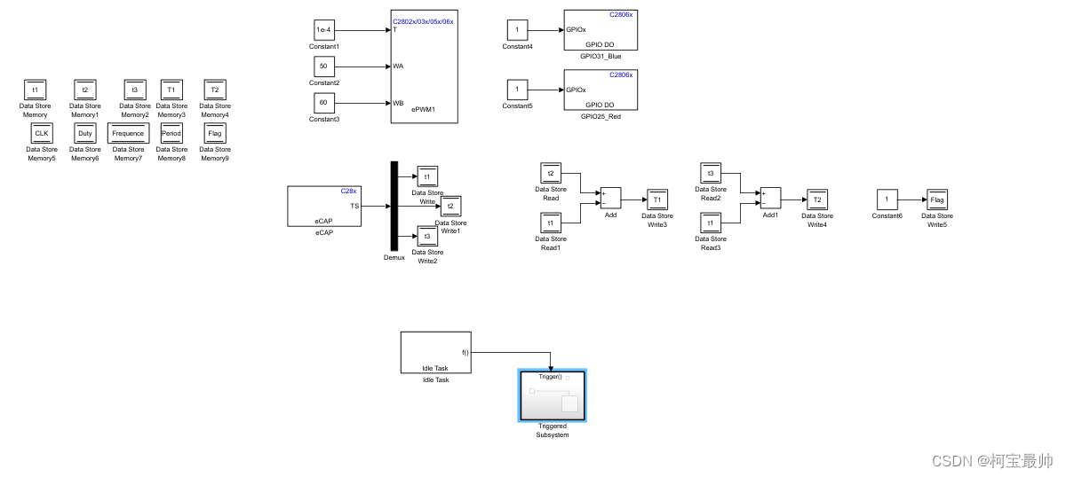 用Data Store Memory模块初始化10个全局变量,用来实现对一方波信号的频率,周期、占空比测量。t1(t2、t3)是第一(二、三)个捕捉事件发生时计数器的值;T1(T2)表示t2-t1(t3-t1),即测试方波的高电平(整个周期)时间对应的计数值;CLK是系统时钟值,Duty是实际方波的占空比,Frequence是方波频率,Period则是周期,Flag表示检测完成时的标志位。