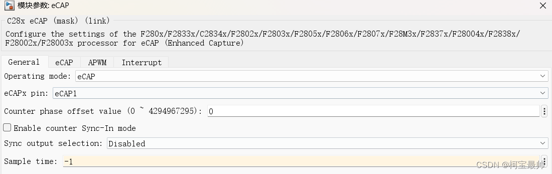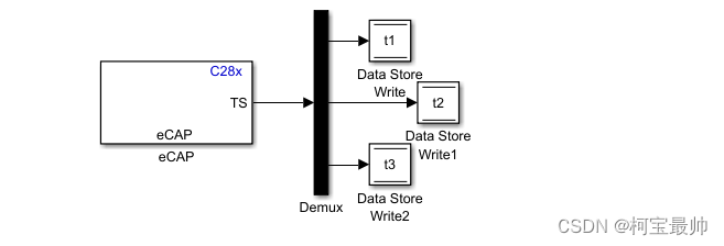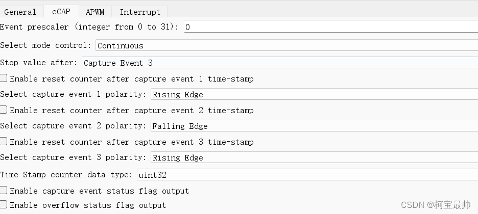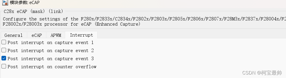 使用eCAP1模式,配置为连续控制。第一次事件的触发极性为上升沿,第二次为下降沿,第三次也为上升沿,计数时间的数据类型为无符号的32位整型。中断配置如下图,在第三次事件之后触发中断,停止计数并重置。在eCAP输出接上Simulink的demux模块,并将输出的值赋予t1、t2、t3(Data StoreWrite模块)