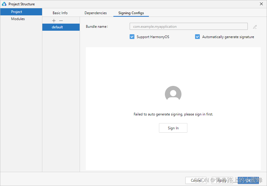 2、进入 File > Project Structure > Project > Signing Configs界面,勾选”Automatically generate signature“(如果是API 8和9工程,需同时勾选”Support HarmonyOS“),即可完成签名。如果未登录,请先单击Sign In进行登录,然后自动完成签名