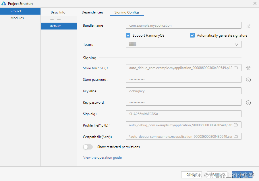 在File > Project Structure > Project > Signing Configs窗口中,去勾选”Automatically generate signature“(API 8和9工程请勾选”support HarmonyOS“),然后配置工程的签名信息。