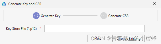 2、在Key Store File中,可以单击 Choose Existing选择已有的密钥文件(存储有密钥的.p12文件) ;如果没有密钥库文件,单击New 进行创建。下面以新创建密钥库文件为例进行说明。