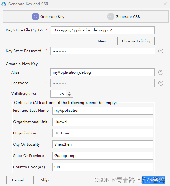 如果本地已有对应的密钥,无需新生成密钥,可以在GenerateKey界面中单击下方的Skip跳过密钥生成过程,直接使用已有密钥生成证书请求文件。