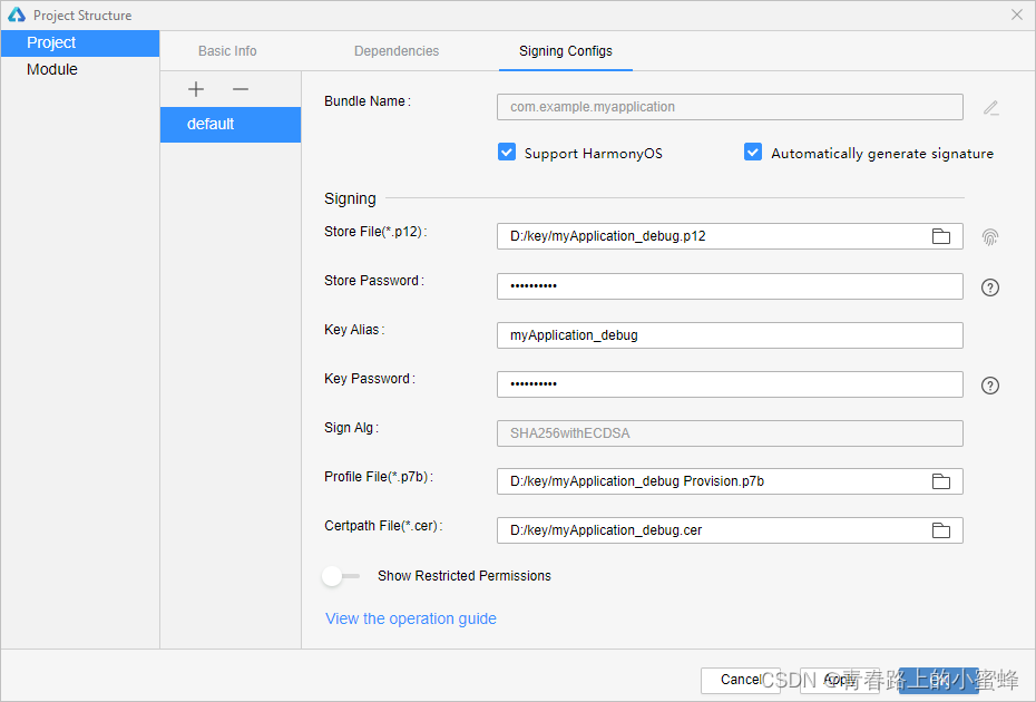 在DevEco Studio中配置密钥(.p12)文件、申请的调试证书(.cer)文件和调试Profile(.p7b)文件。