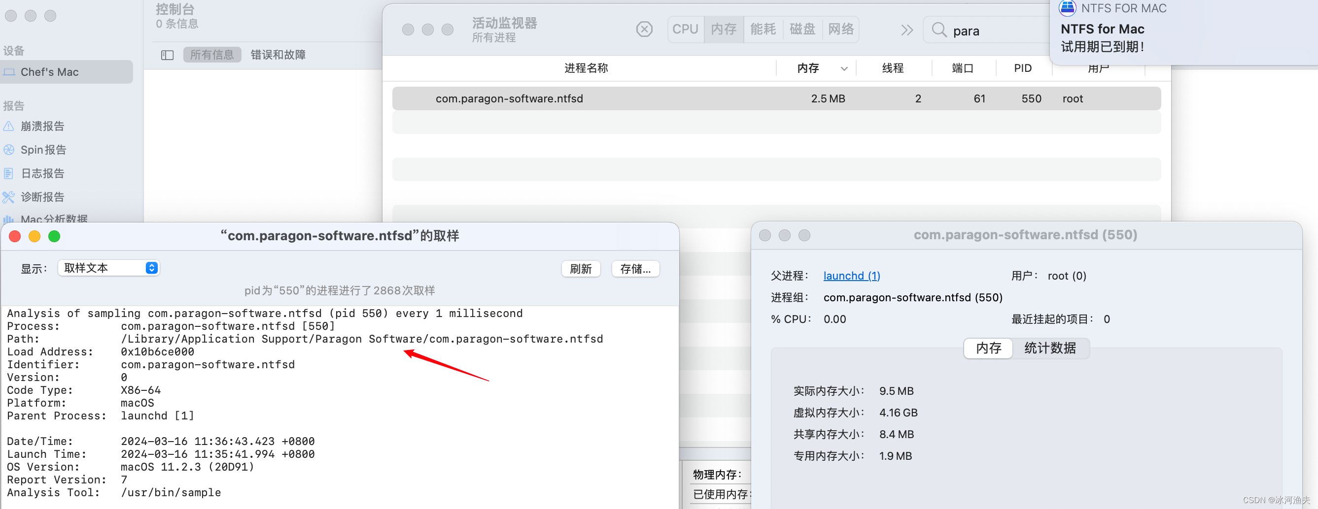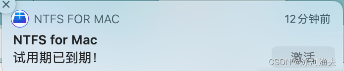 之前因MacBook读写NTFS格式移动硬盘,我安装并使用了 Paragon NTFS for Mac ,试用期结束后将其从【应用程序】中卸载移除了。但之后每次开机启动时,系统还是会弹出【激活】通知,如下图