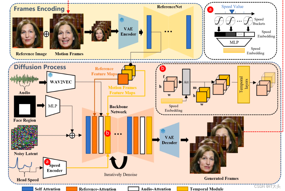 模型采用 stable diffusion 这一当下的主流框架作为整个模型基础框架,整个框架主要由两个阶段组成:在称为 Frames Encoding 这一初始阶段,ReferenceNet 用于从 reference image 和 motion frames 中提取特征。然后进入 Diffusion Process 阶段,模型输入不仅包括上面的两种特征,还需要预训练的 audio encoder 处理的音频特征,speed encoder 处理的头部速度嵌入,还有照片中的面部区域掩码特征以及多帧噪声集,通过主干网络的反复去燥操作完美控制面部图像的生成。