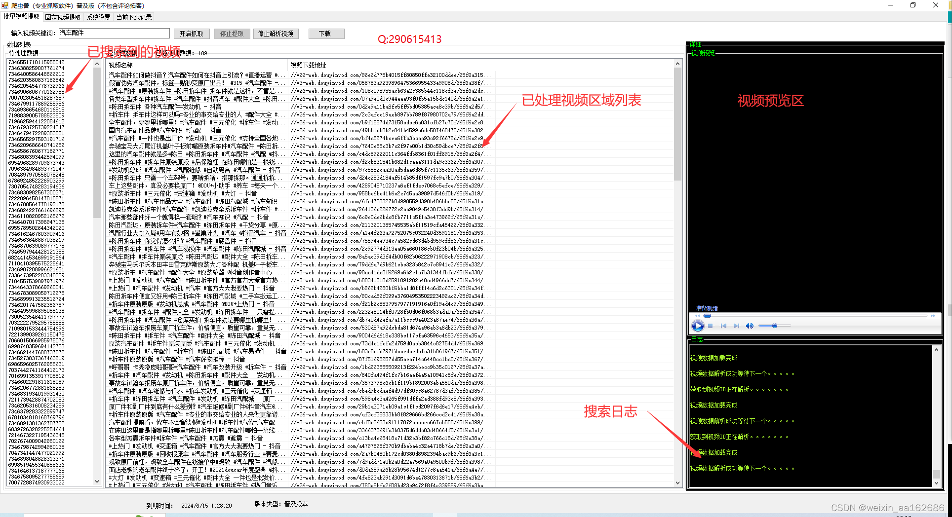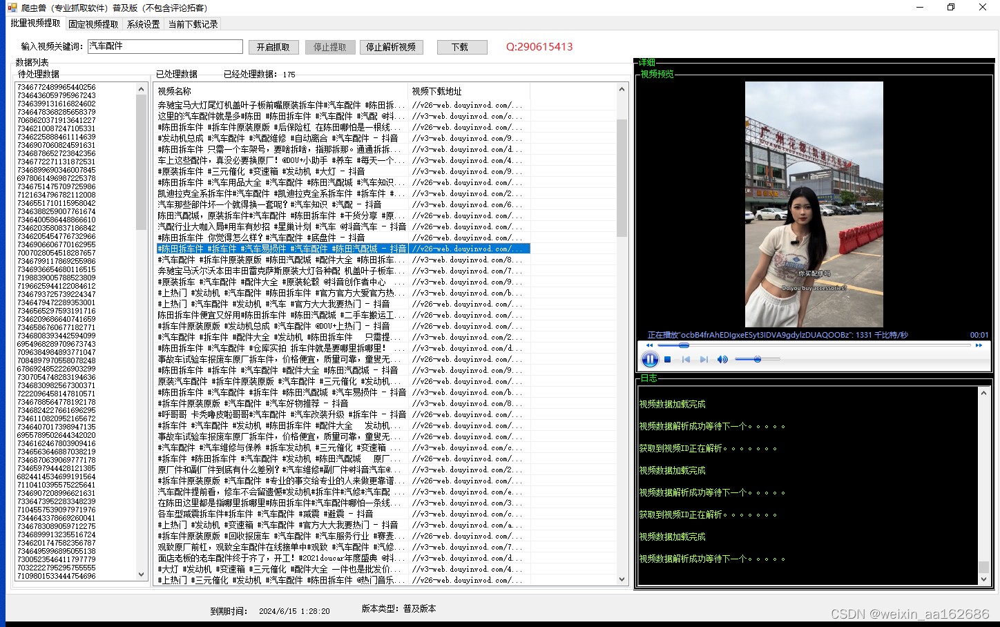 1. 关键词批量采集视频的解析 对特定关键词进行搜索和视频提取,例如输入“汽车配件”,系统将搜索并列出相关抖音视频供查看和下载。视频来源真实,实时搜索数据包括当天和3年内的视频内容,确保搜索结果与抖音平台一致。下图展示了根据“汽车配件”搜索所得内容。
