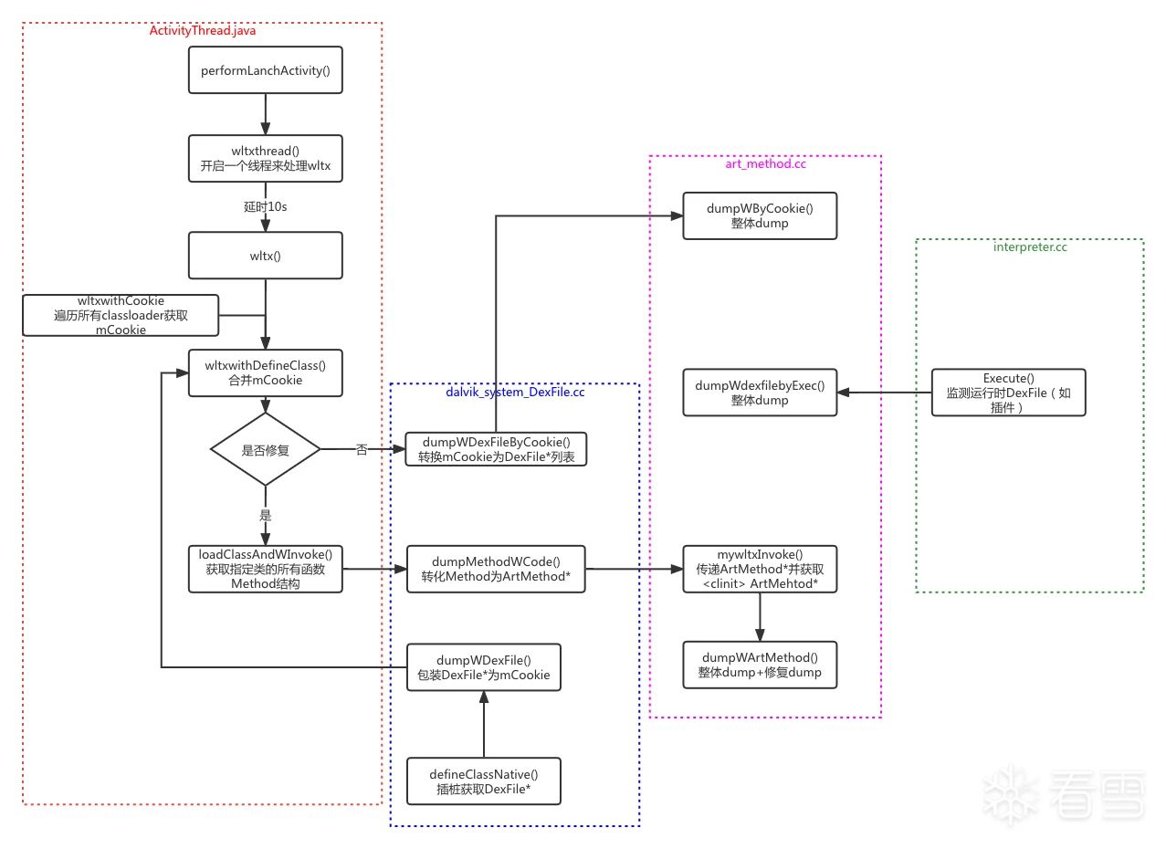 这里考虑获取所有的DexFile,然后合并mCookie去做处理。首先在defineClassNative插桩,收集所有DexFIle指针,将其转化为mCookie1(long[]),返回给java层,合并反射获得的mCookie2为mCookie,然后使用原有逻辑获取类列表,遍历加载类的所有函数,然后dump。