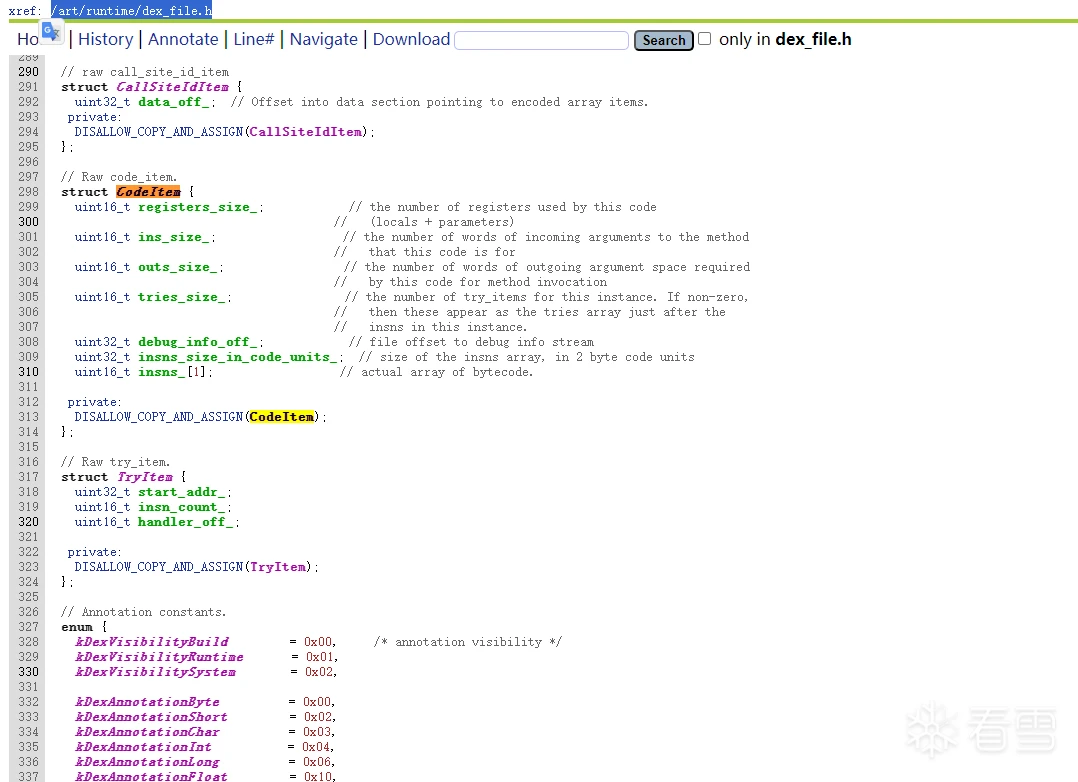 Android11源码中codeitem结构体在: /art/libdexfile/dex/dex_file_structs.h: