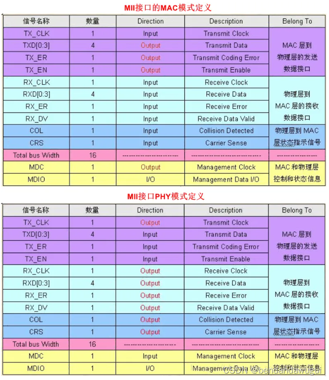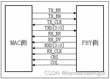 MII接口主要包括四个部分。一是从MAC层到PHY层的发送数据接口,二是从PHY层到MAC层的接收数据接口,三是从PHY层到MAC层的状态指示信号,四是MAC层和PHY层之间传送控制和状态信息的MDIO接口。