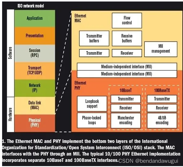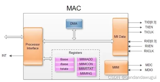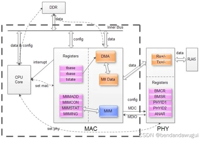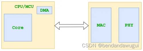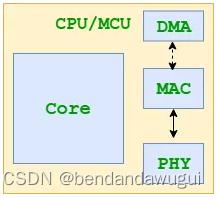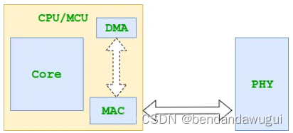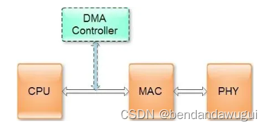 DMA控制器通常属于CPU的一部分,用虚线放在这里是为了表示DMA控制器可能会参与到网口数据传输中。但是,在实际的设计中,以上三部分并不一定独立分开的。由于,PHY整合了大量模拟硬件,而MAC是典型的全数字器件。