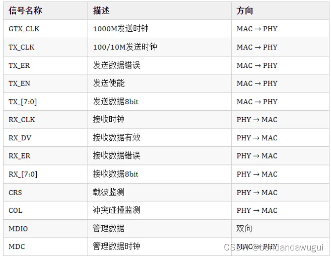 GMII是千兆网的MII接口,这个也有相应的RGMII接口,表示简化了的GMII接口。GMII 采用 8 位接口数据,工作时钟125MHz,因此传输速率可达 1000Mbps。