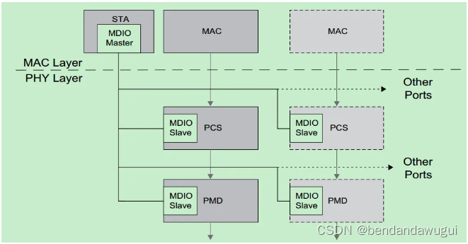 MDIO主机(即产生MDC时钟的设备)通常被称为STA(Station Management Entity),而MDIO从机通常被称为MMD(MDIO Management Device)。通常STA都是MAC层器件的一部分,而MMD则是PHY层器件的一部分。