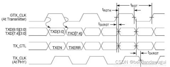 虽然RGMII信号线减半,但TXC/RXC时钟仍为125Mhz,为了达到1000Mbit的传输速率,TXD/RXD信号线在时钟上升沿发送接收GMII接口中的TXD[3:0]/RXD[3:0],在时钟下降沿发送接收TXD[7:4]/RXD[7:4],并且信号TX_CTL反应了TX_EN和TX_ER状态,即在TXC上升沿发送TX_EN,下降沿发送TX_ER,同样的道理试用于RX_CTL,下图为发送接收的时序: