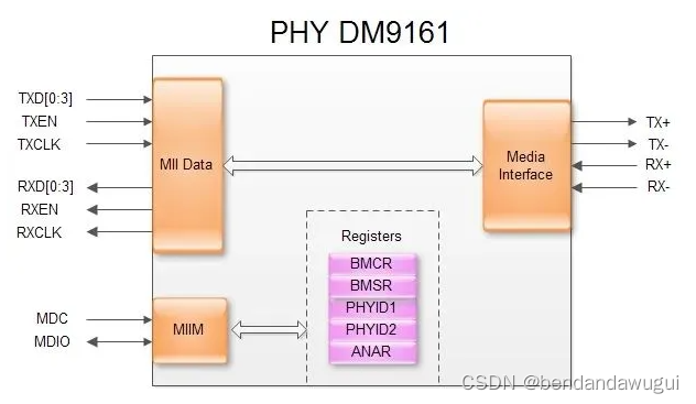 PHY((Physical Layer,PHY))是IEEE802.3中定义的一个标准模块,STA(station management entity,管理实体,一般为MAC或CPU)通过SMI(Serial Manage Interface)对PHY的行为、状态进行管理和控制,而具体管理和控制动作是通过读写PHY内部的寄存器实现的。一个PHY的基本结构如下图: