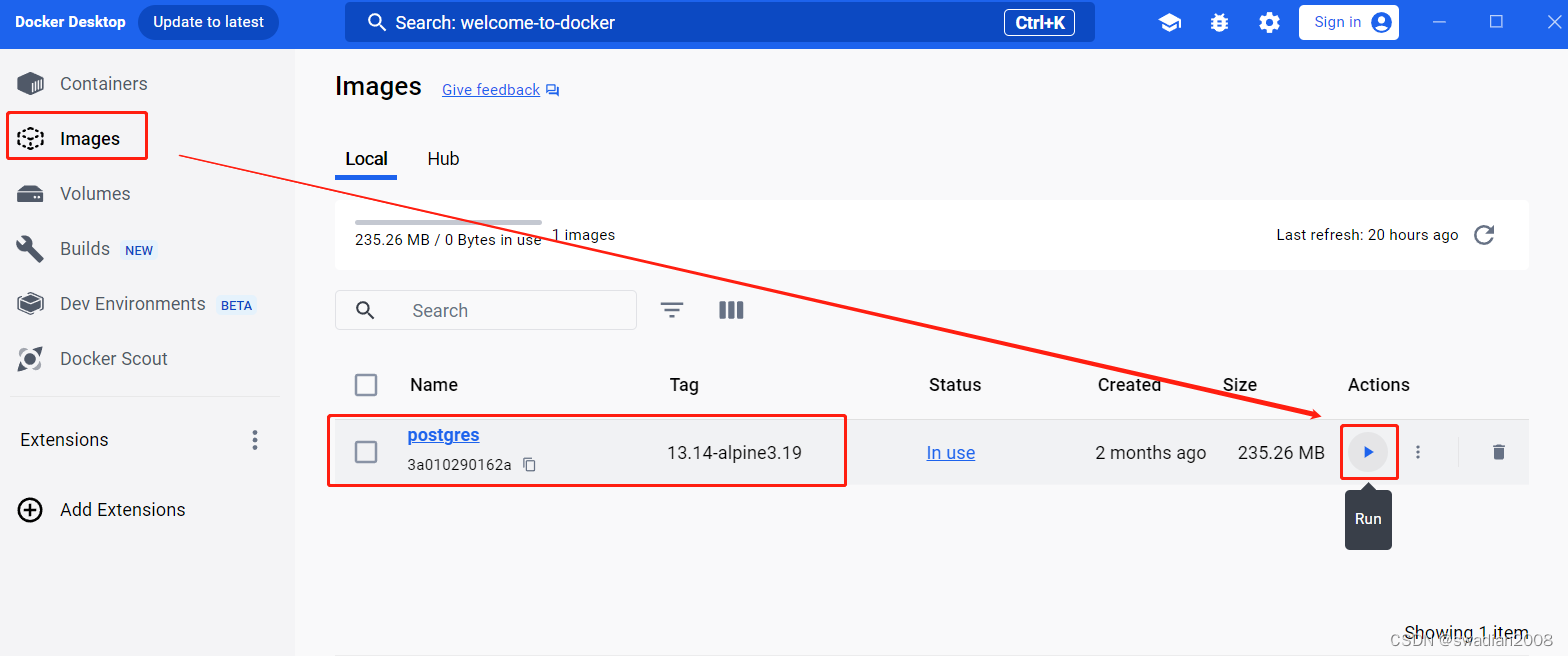 就拿我们刚才拉取 postgres 镜像举例,首先找到我们拉取的镜像列表窗口,如下图所示: