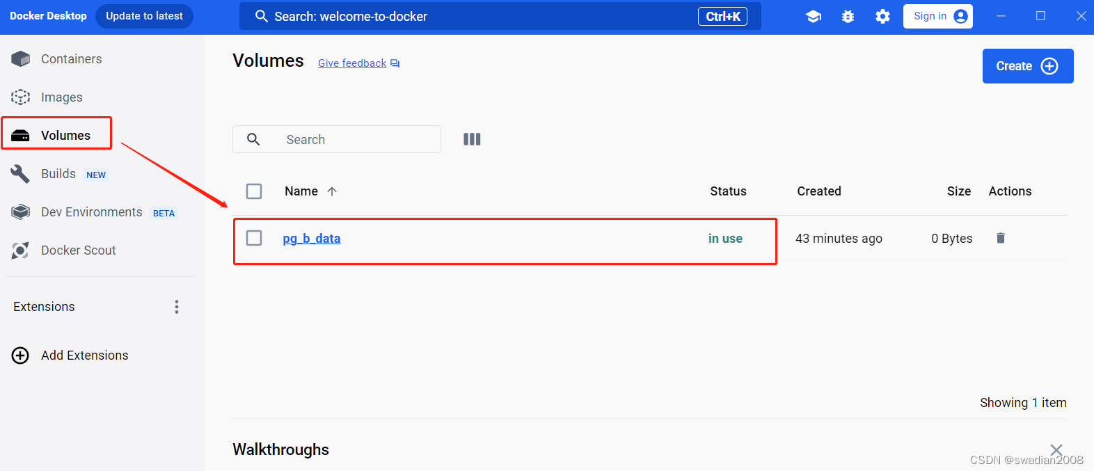 上图中,"pg_b_data" 并不是一个在 host 主机中存在的路径,所以容器启动时会使用 "pg_b_data" 自动创建一个名为 "pg_b_data" 的数据卷,如下图所示: