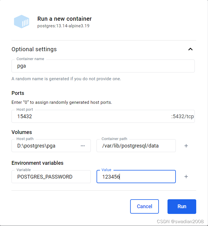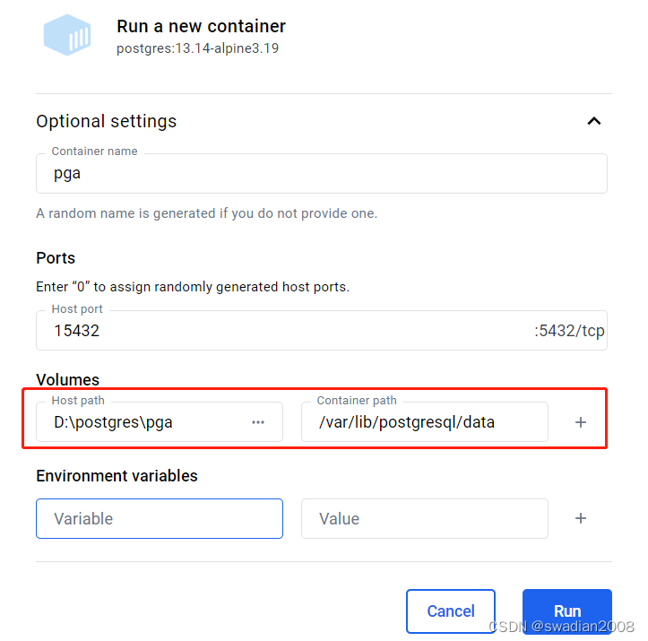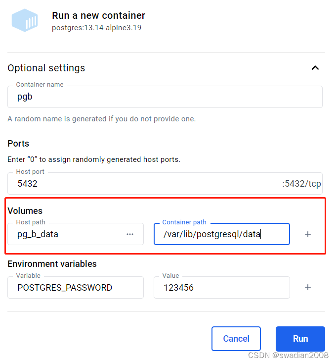 第二种是使用数据卷(volumes),这个就开放多了,如果所填的值不是主机路径,那么 docker desktop 会默认使用该值命名并创建一个数据卷: