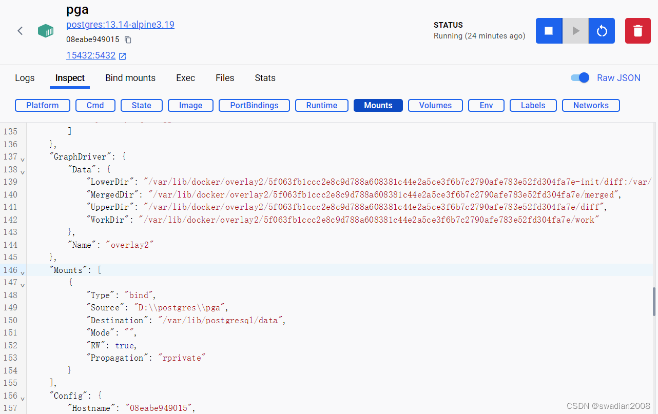 点击 view details,你可以看到与该容器有关的详细信息,比如容器的运行日志、挂载、容器内文件夹、容器运行状况等,如下图所示: