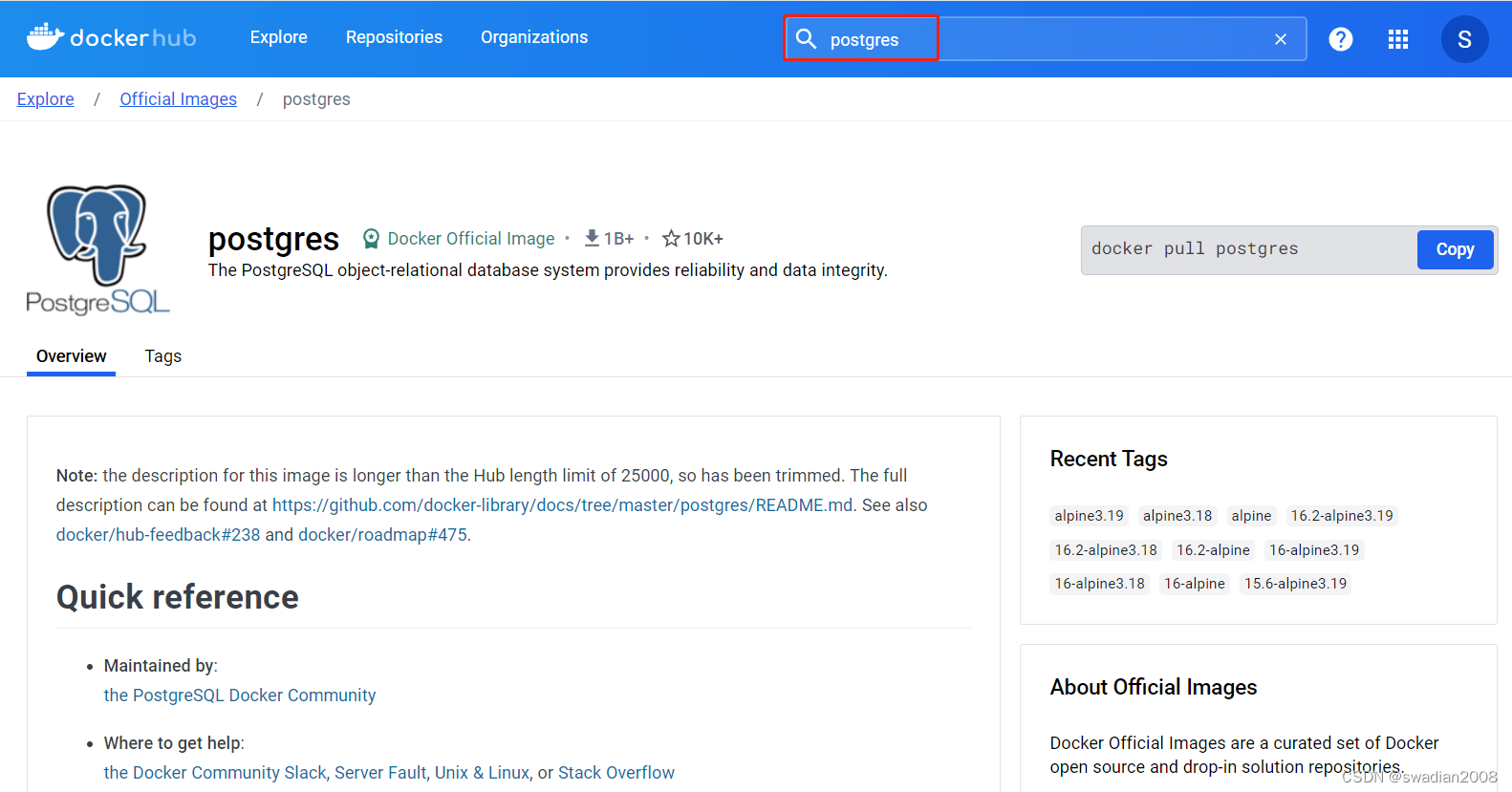不用担心,官方文档全都给你安排好了,就比如我们上边的 postgres 镜像,在官方仓库中进行搜索,即可得到关于这个镜像的详细操作信息: